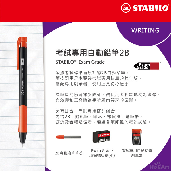 Exam Grade考試用品,在鉛筆筆芯上有著獨特的粗與濃黑設計,好寫易分辨,橡皮擦不含PVC有毒材質,100%天然樹脂所製造,清潔容易。