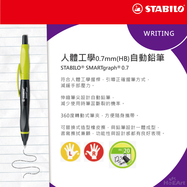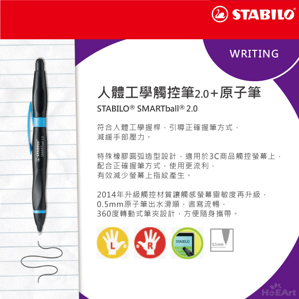 3C時代全面化,SMARTball觸控兩用筆,不論您是左撇子或右撇子,都能夠精準地在觸控螢幕上滑動,觸控書寫不再是困擾,讓STABILO帶給你您如流水流暢的快感。