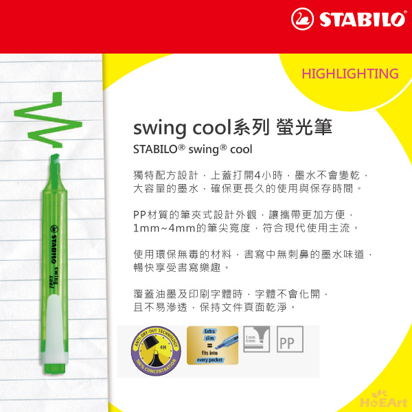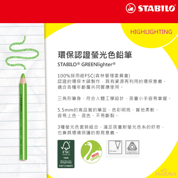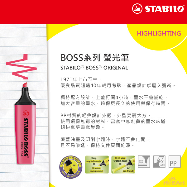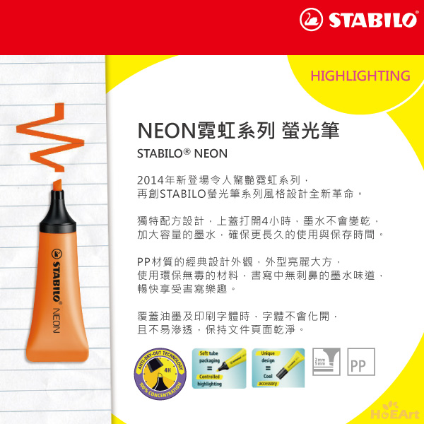 是否有過筆記本用螢光筆注記重點時,墨水不均勻滲透到背面,字跡暈開,髒亂難以閱讀的狀況。 STABILO是全球第一支製造螢光筆的品牌,螢光系列經由獨特的配方設計,即使忘記蓋上筆蓋,數小時後筆頭也不易乾。 當覆蓋在油墨上時,字跡不暈開,可保持頁面乾淨。 使用PP材質設計,環保又無毒,書寫中也不散發出刺鼻難聞的味道。 在墨水容量上有著突破性的設計,保存使用更長久。 STABILO螢光系列,豐富多樣的色彩,帶你體驗螢光色彩間奇幻之旅,開拓前所未有的視覺感受。