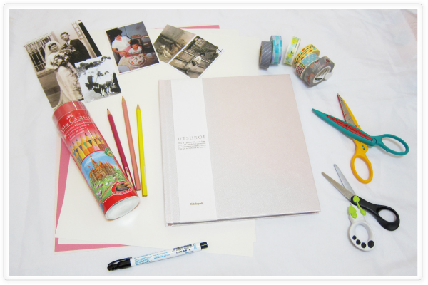 1. 自黏相本1本。2.找出媽媽年輕時的照片、結婚照或生活照數張。3. 剪刀、花邊剪刀、紙膠帶、美術紙(粉彩紙、丹迪紙之類的,只要你覺得質感漂亮都可)、彩色鉛筆(或彩色筆)、鋼珠筆