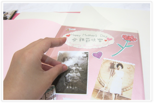 把自黏相本內頁的透明模掀開,將你所準備的照片及素材們排好位置,在適當的角落黏上紙膠帶及裝飾。將透明模輕輕蓋上,就能輕鬆做好一面囉!